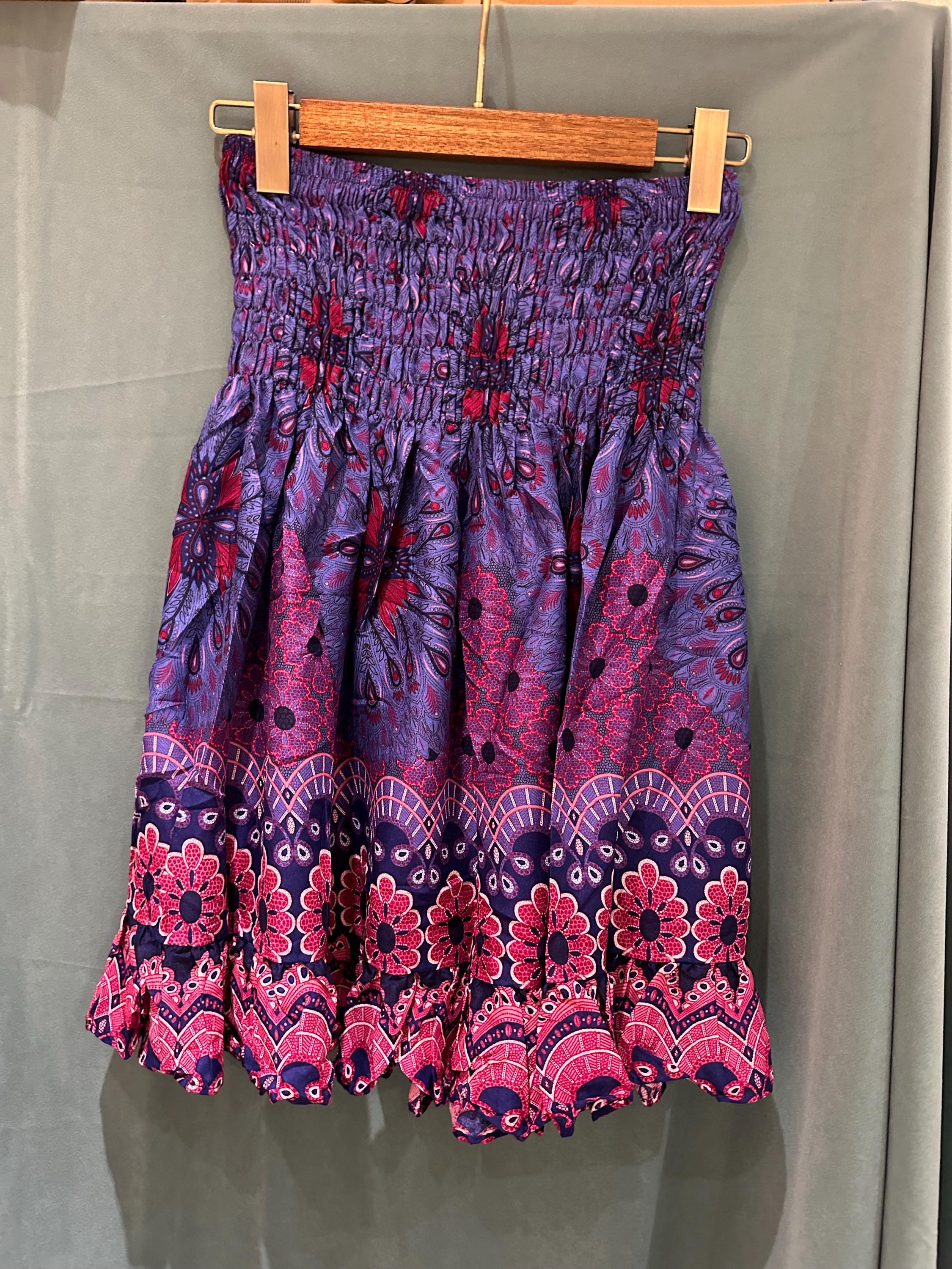 Boho style short women skater skirt with colorful burgundy print. This hippie skirt is made with light weight rayon fabric. Boho skirt have elastic smoked waist. It's great option for outdoor and indoor clothing, festival wear, dance, summer, beach or just casual day in home. Pull-on bohemian skirt comes in three sizes from XS-XXL. Please read detailed size dimensions for this boho skirt below or in the size photo.