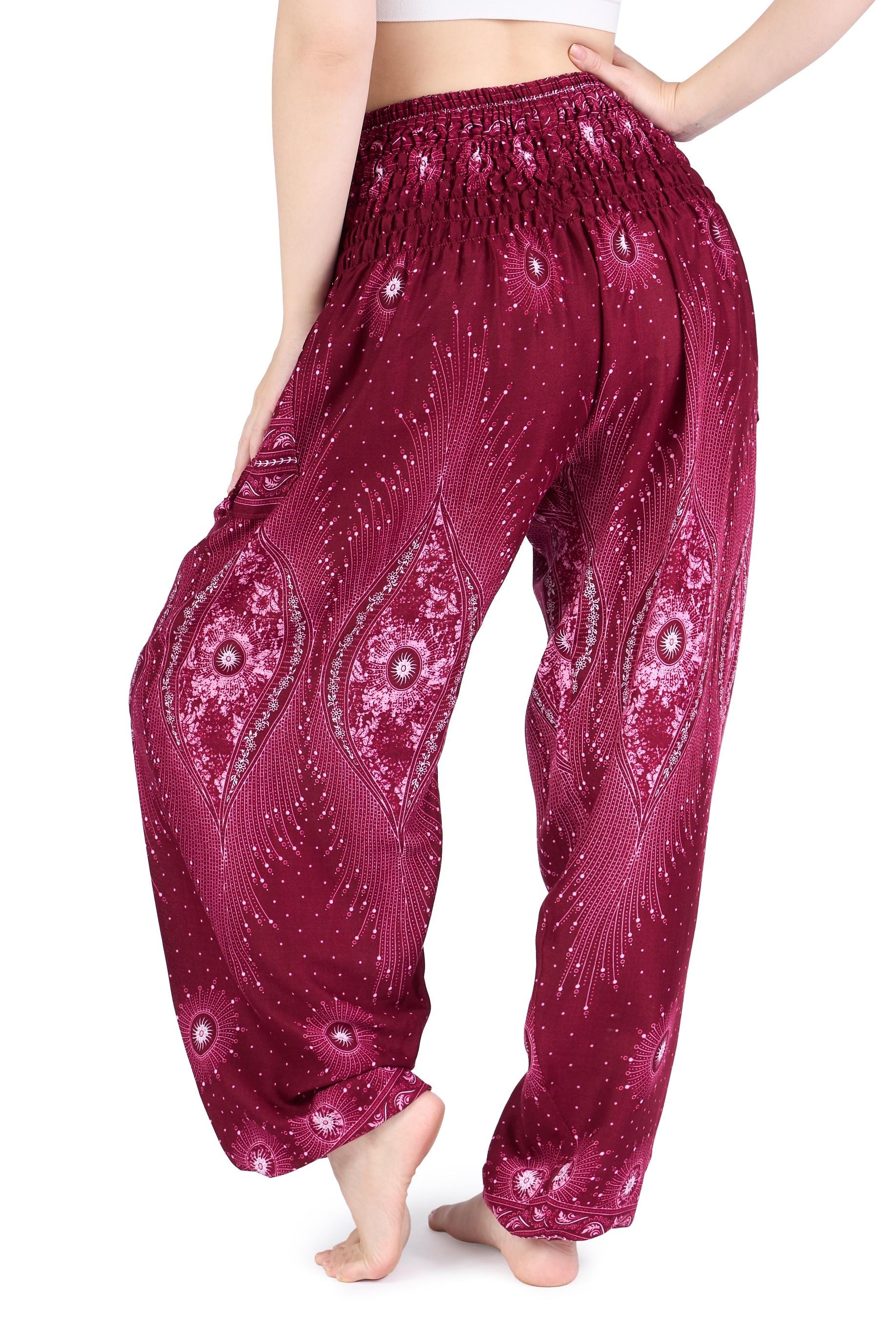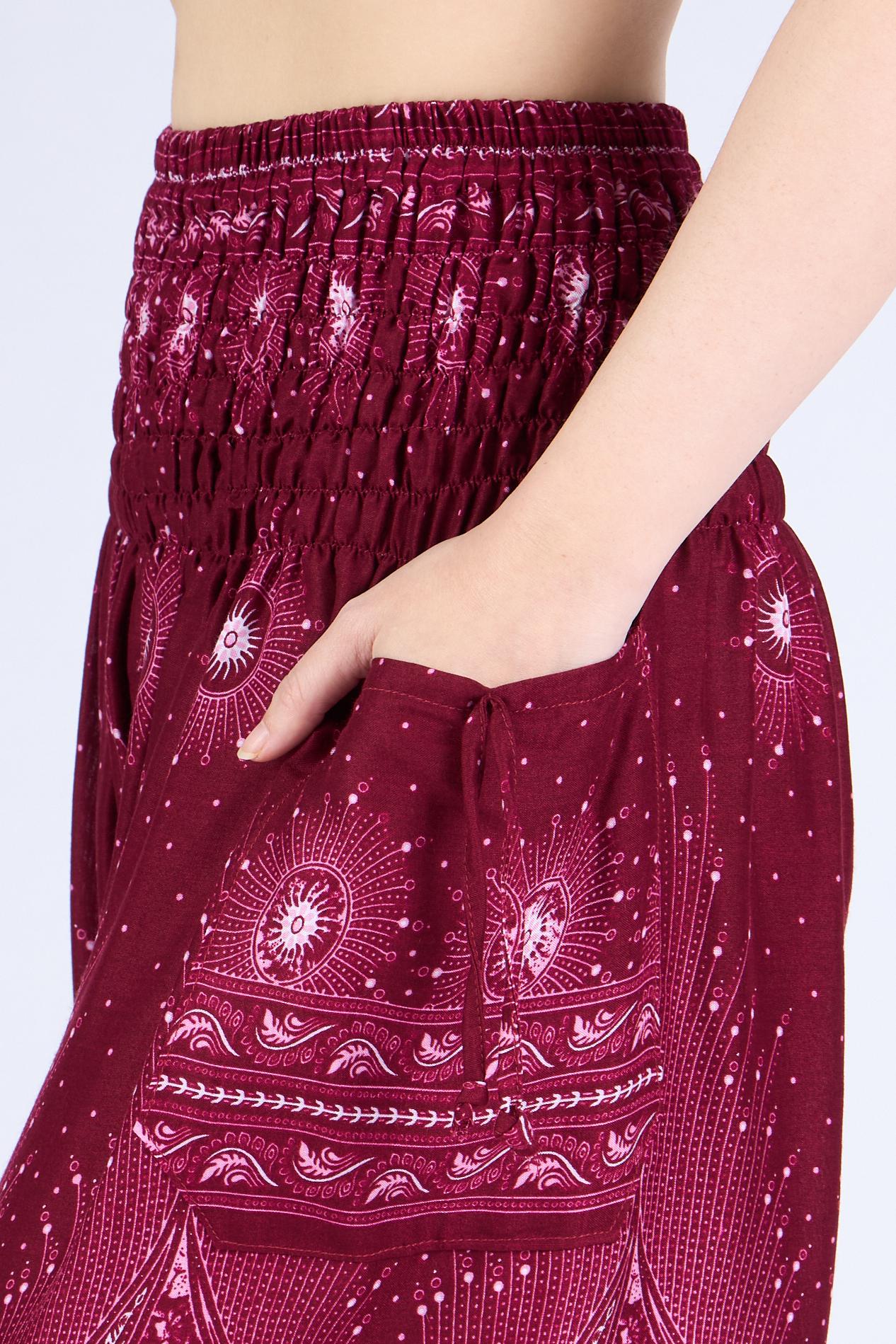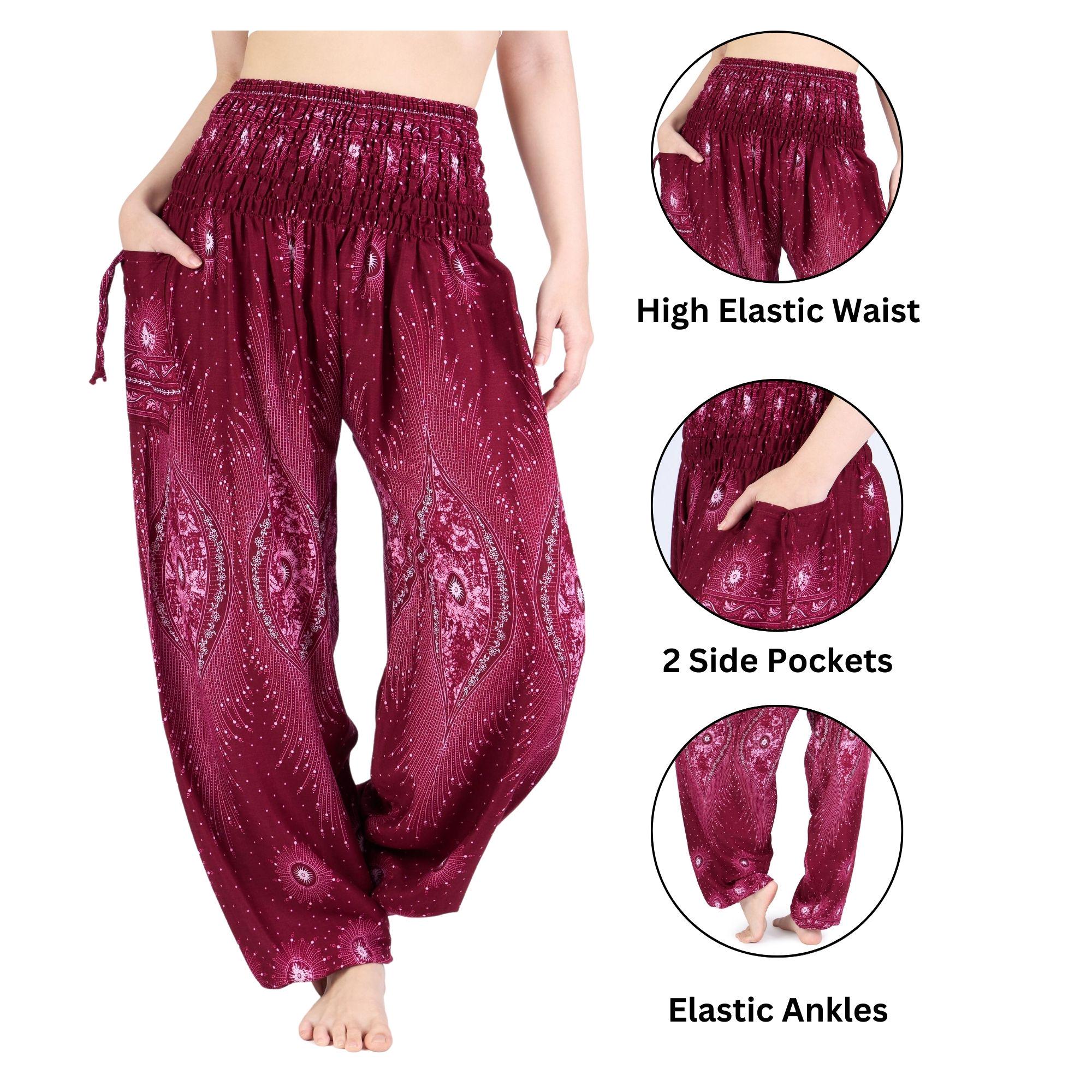 Burgundy Red Boho Harem Pants for Women with effortless comfort meets vibrant bohemian style. Crafted from breathable, lightweight rayon, these pants keep you cool and comfortable in any season. The smocked elastic waist flatters every shape with a flexible fit, while two handy side pockets add everyday practicality. Gently elastic ankles create a graceful silhouette that flows with your every move.