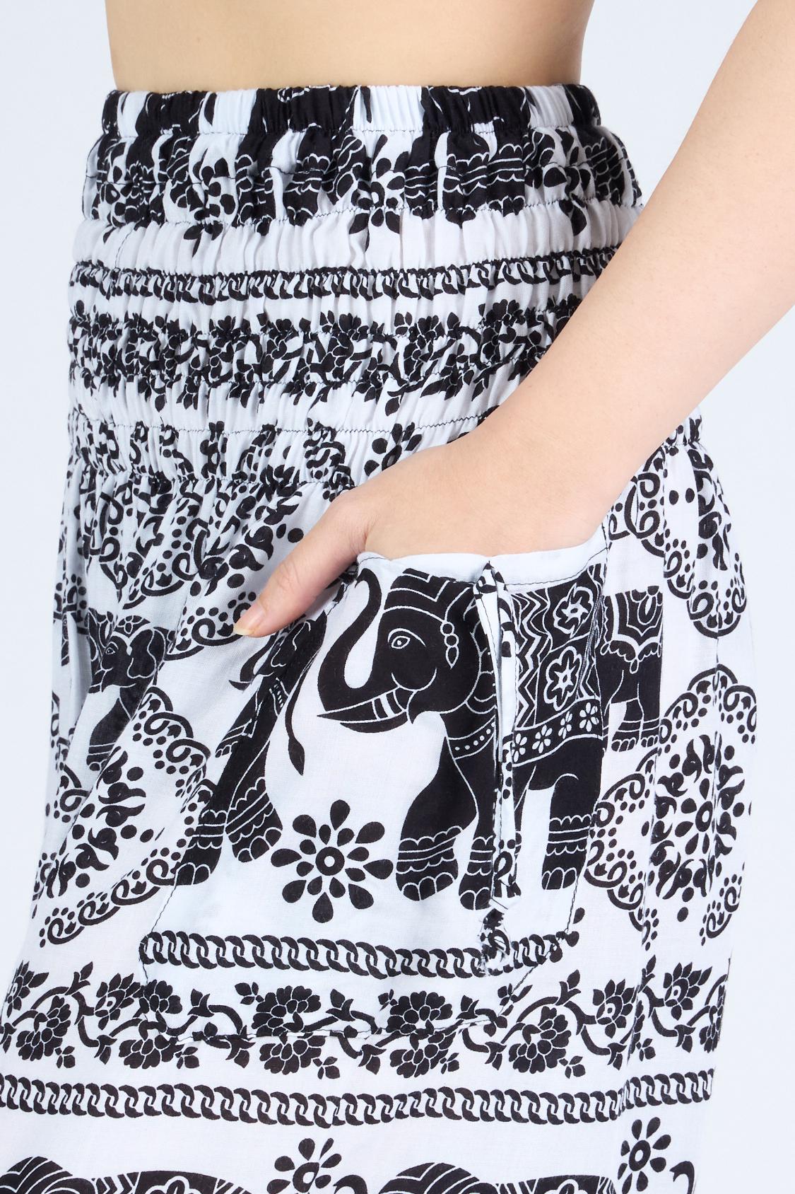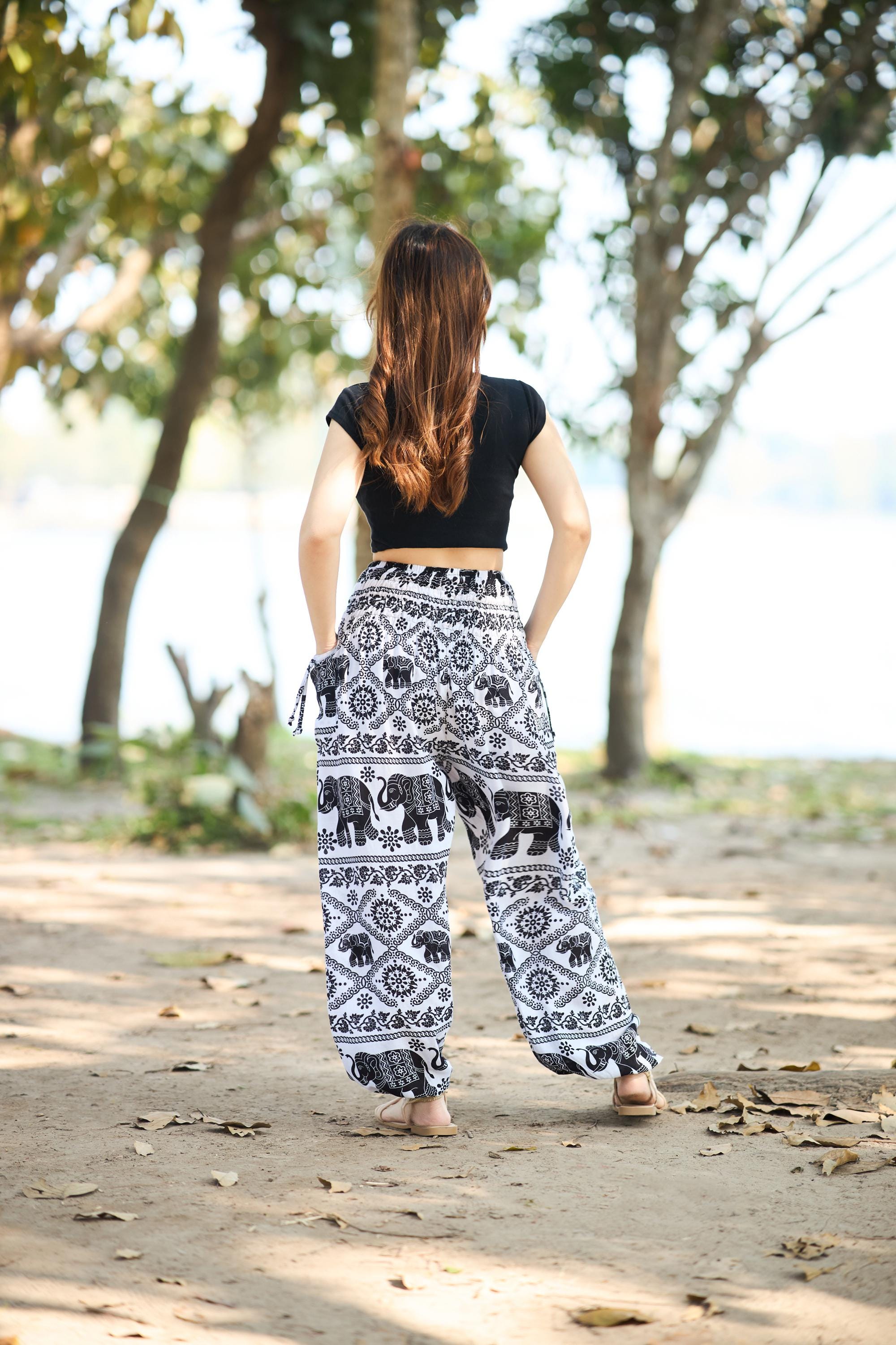 Hippie pants with comfort and effortless boho style with our white and black elephant print harem pants for women. Made from breathable, lightweight rayon, these pants feature a smocked elastic waist, two handy side pockets, and elastic ankles for easy movement. Perfect for yoga, travel, lounging, or festival days — they combine comfort, function, and timeless bohemian charm in one flattering fit.