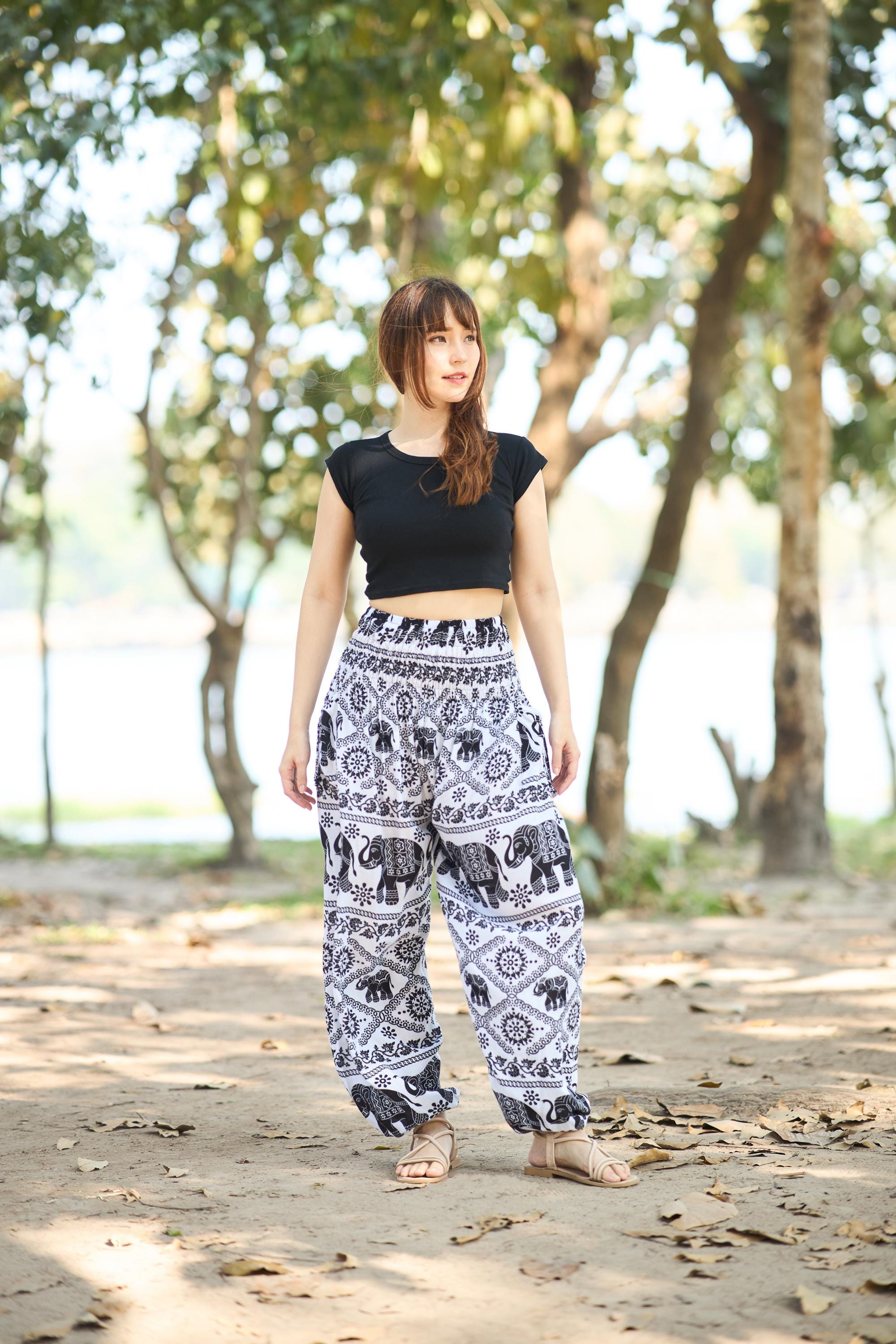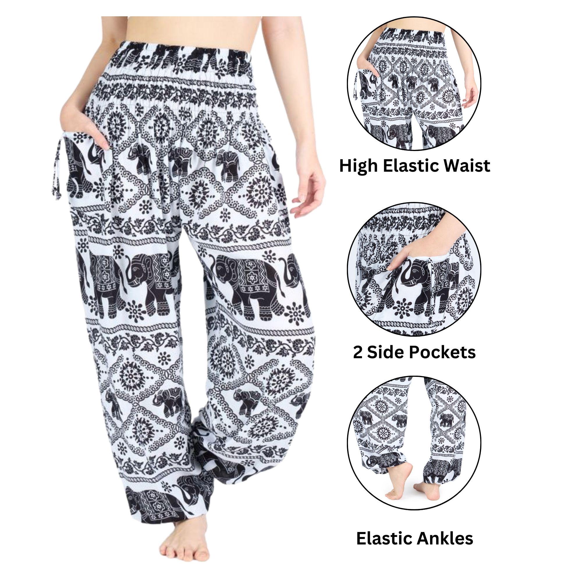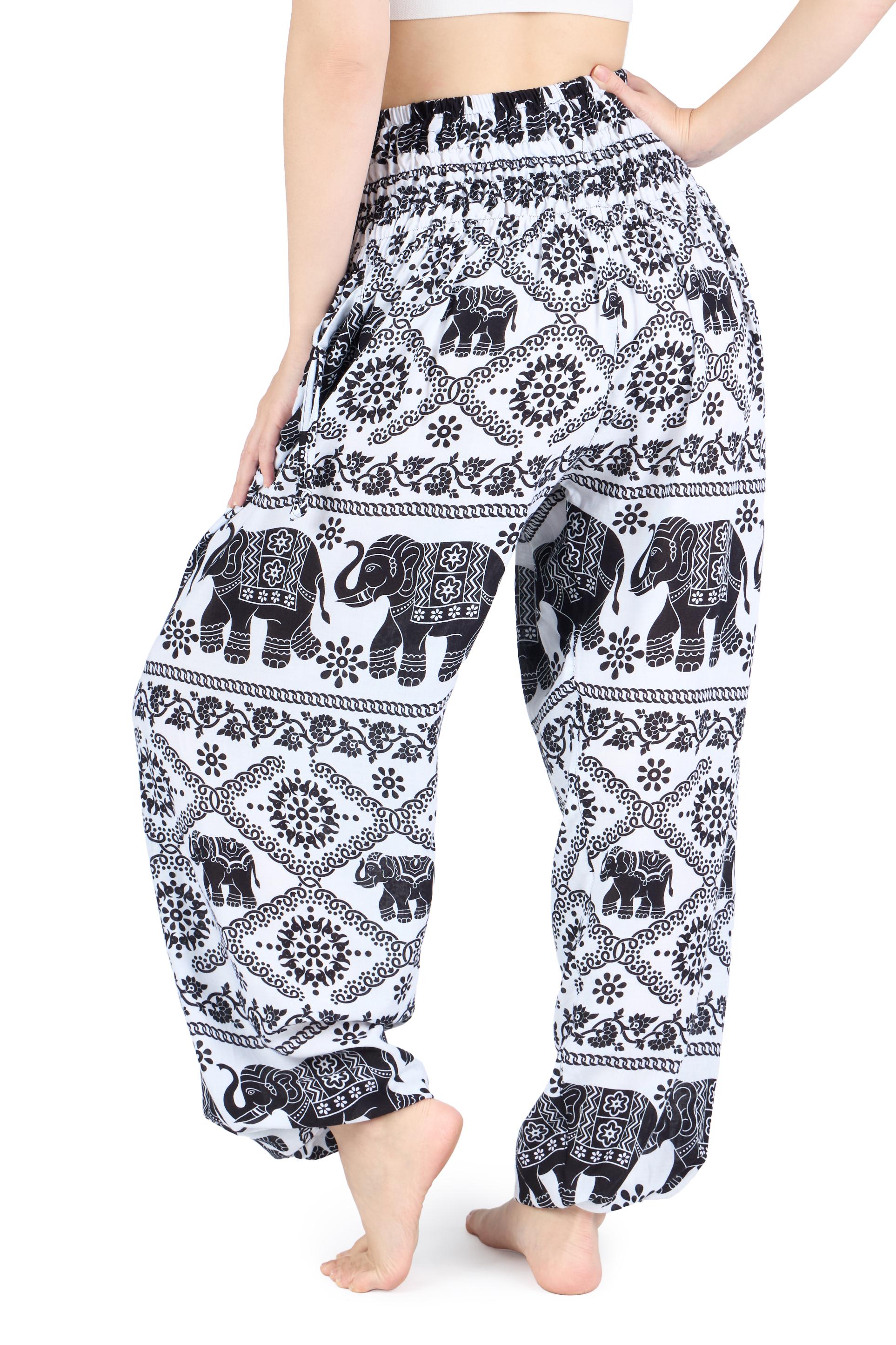 White Black Elephant Harem Pants Women - Lightweight Smocked Waist Yoga Pants - Boho Hippie Trousers - S-XXL - 2 Pockets and Elastic Ankles