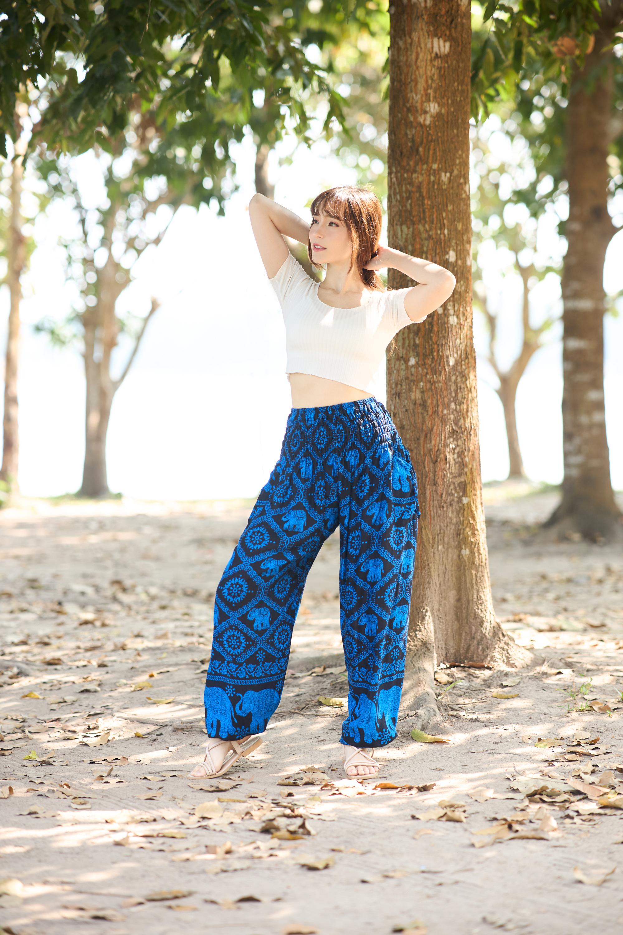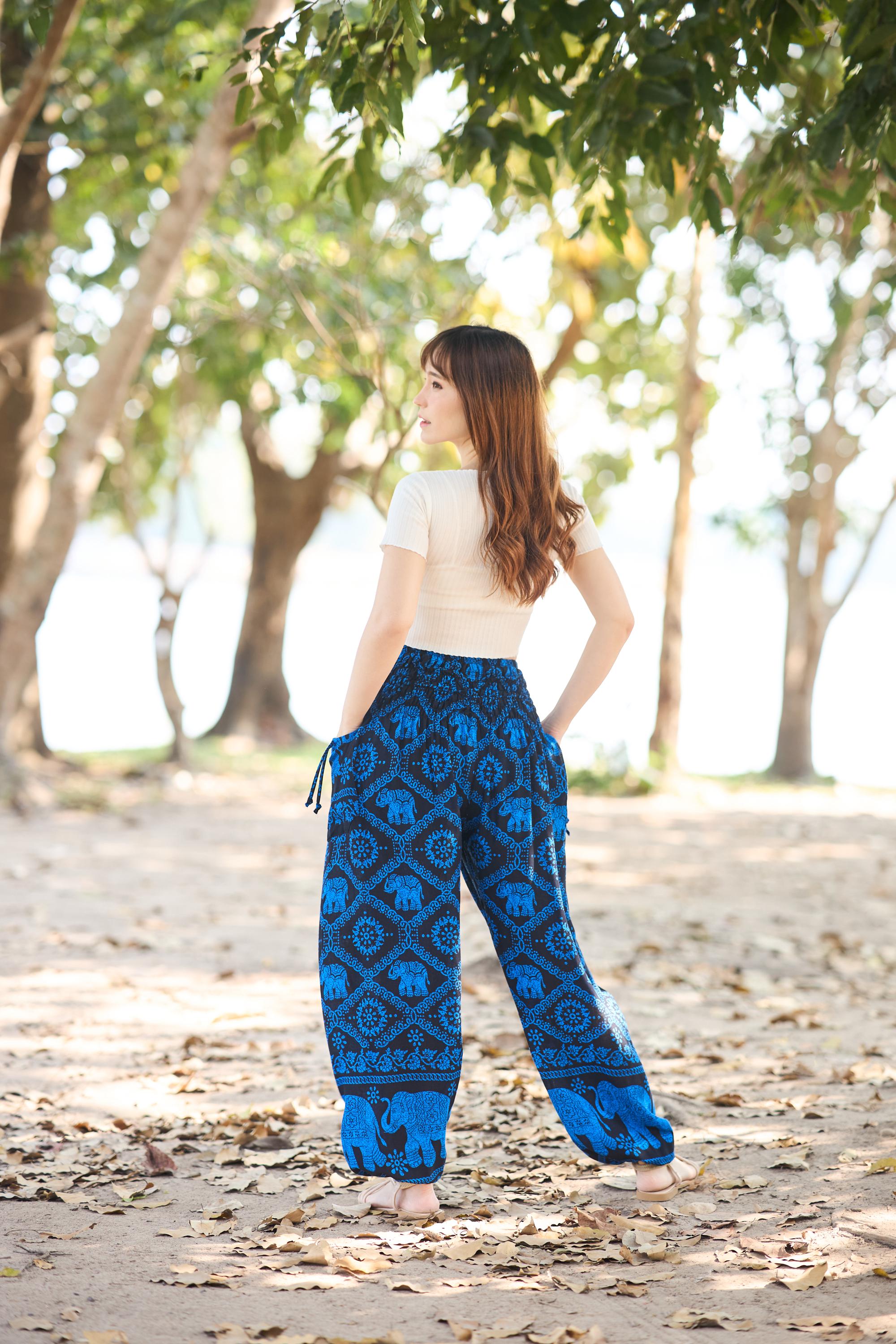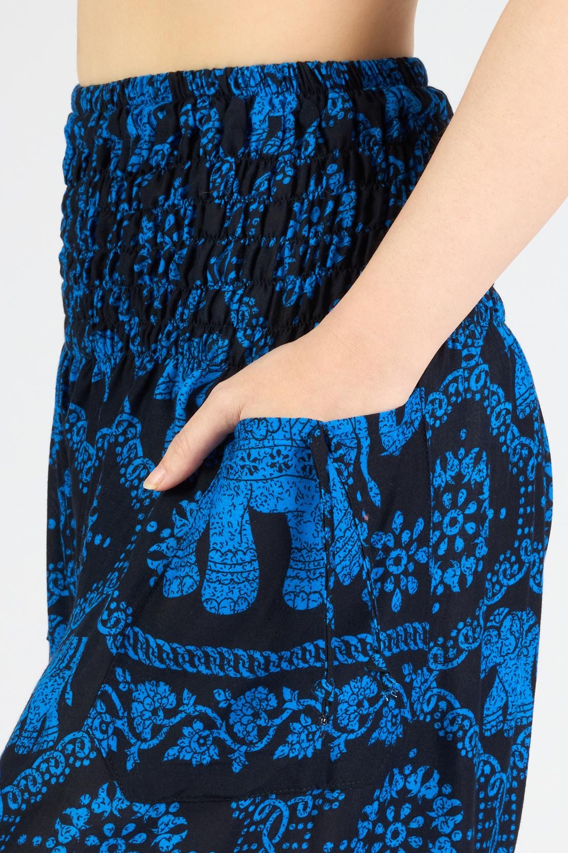 Bring color and comfort into your everyday style with these black and blue elephant print harem pants for women. Made from lightweight, breathable rayon, they feature a soft smocked waist, two side pockets, and gently elastic ankles for easy movement. Perfect for yoga, travel, festivals, or relaxing at home — these pants blend boho elegance with effortless comfort in every detail.