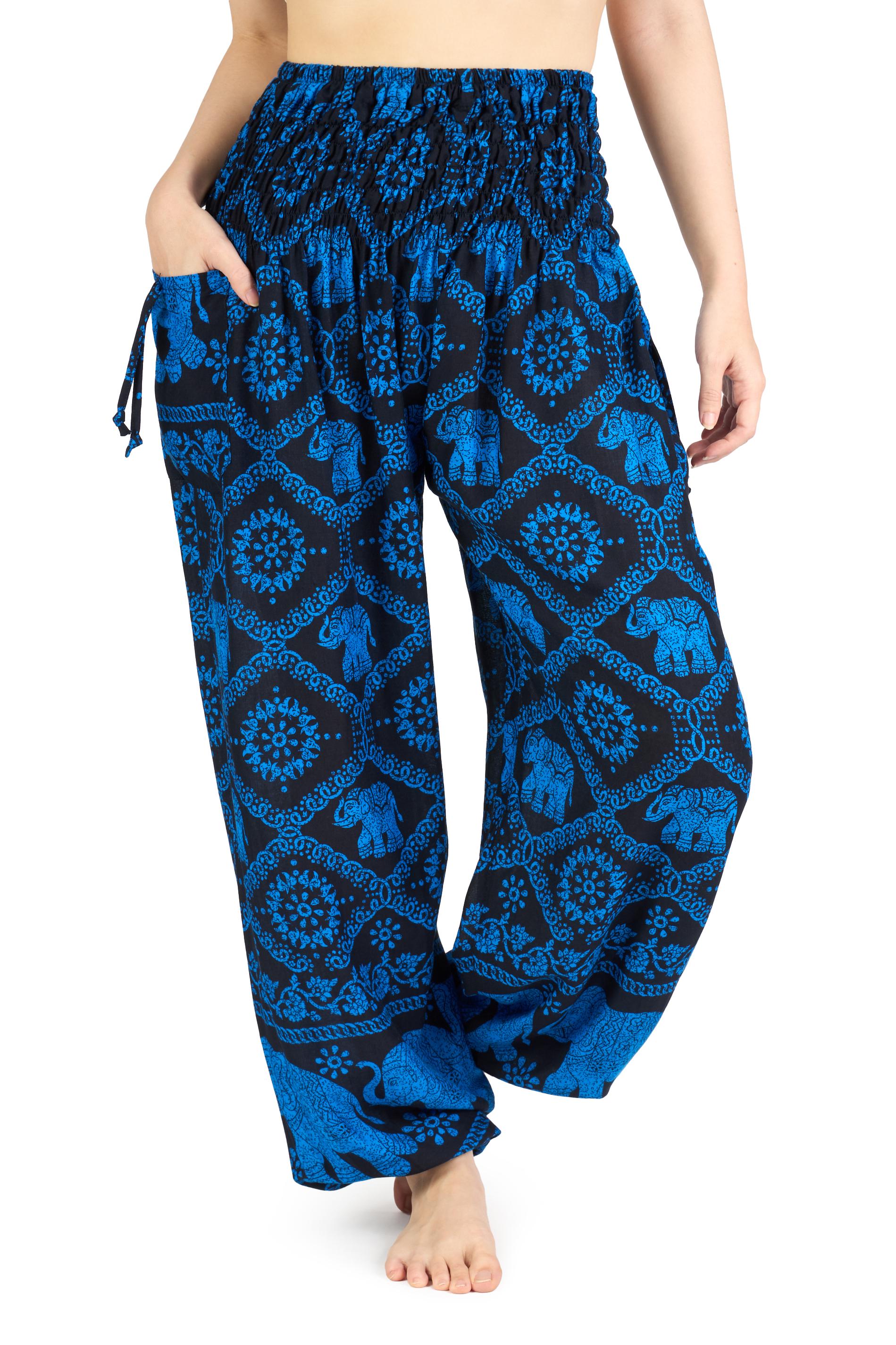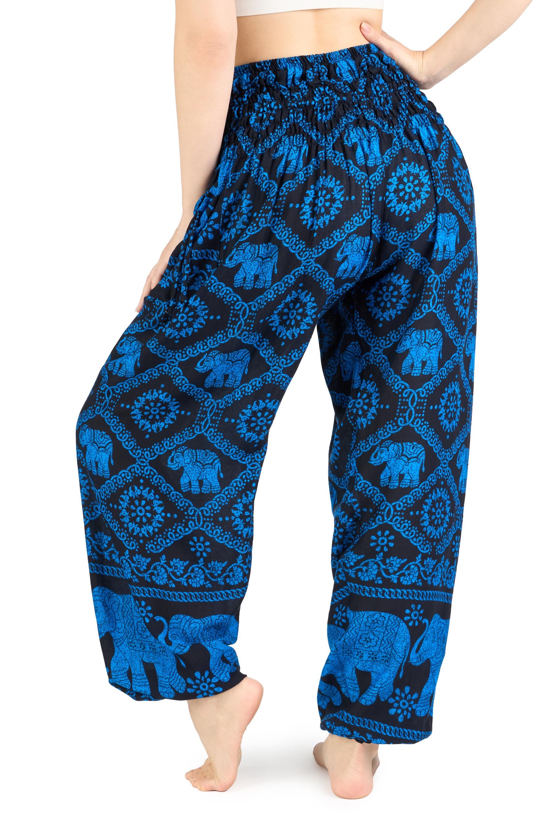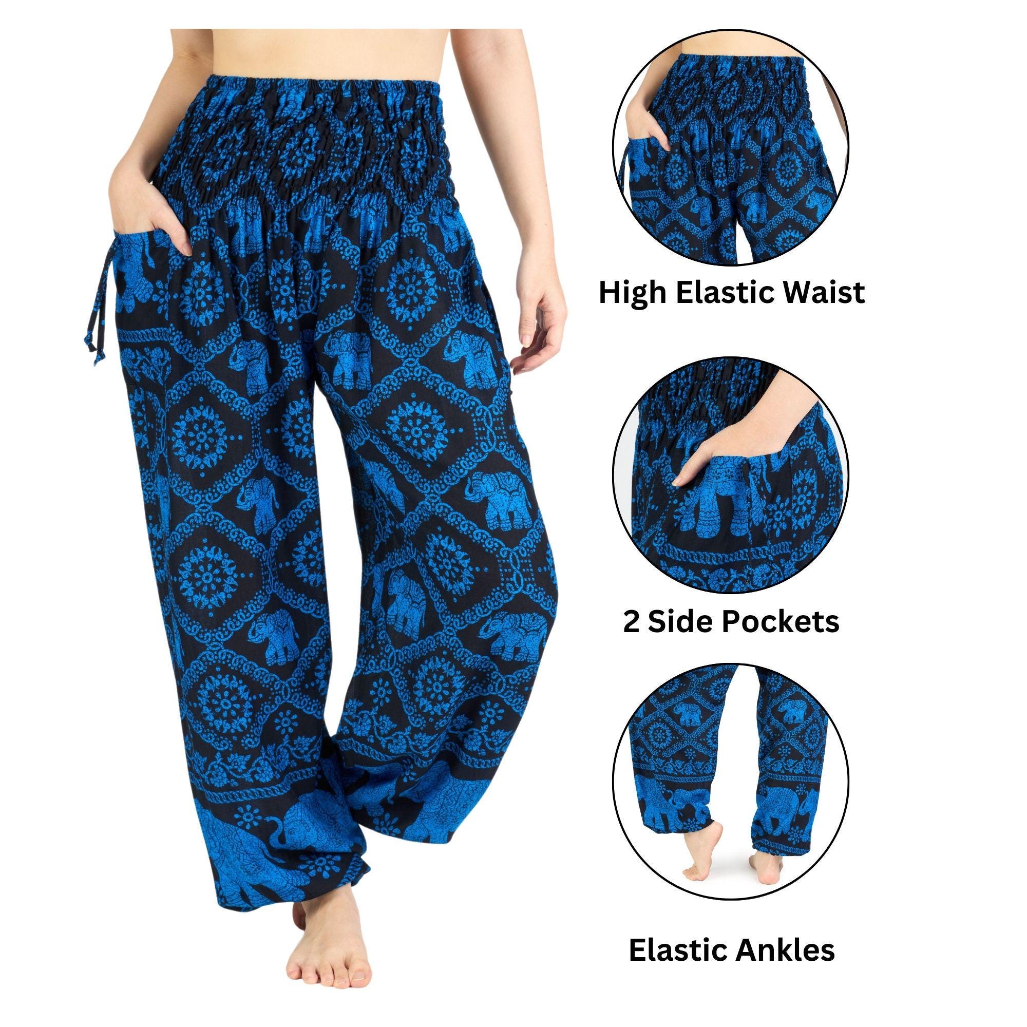 Black Blue Harem Pants Women Elephant Print - Boho Yoga Pants with Smocked Waist - Lightweight Rayon Trousers 2 Pockets and Elastic Ankles