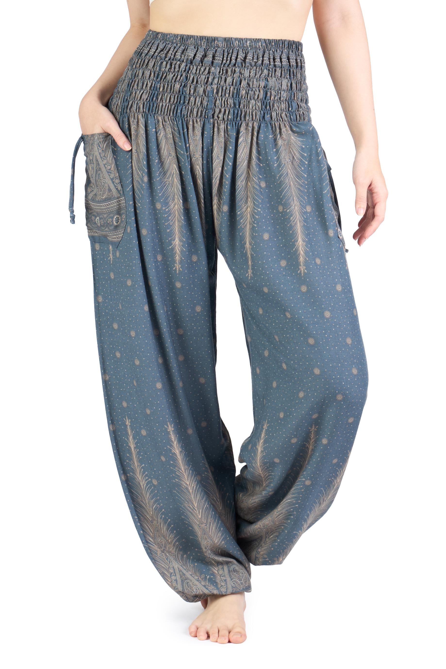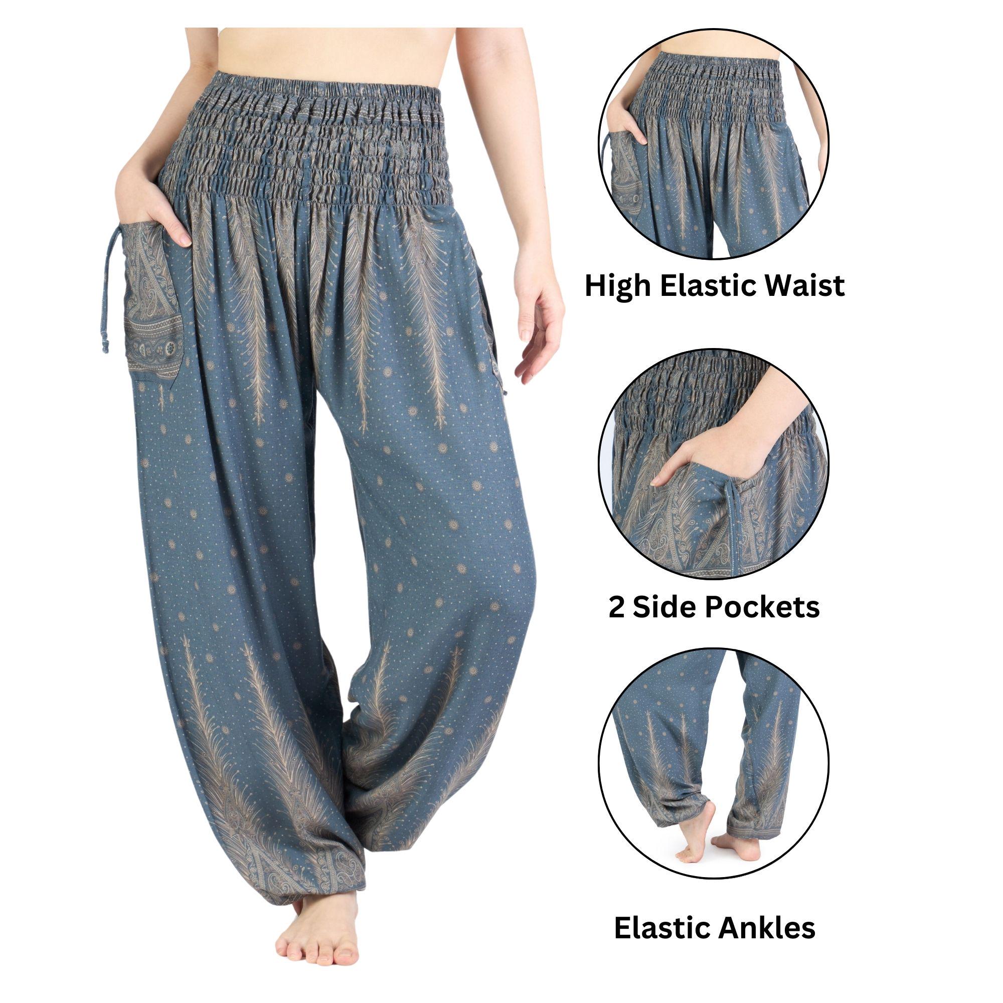 Peacock Feather Harem Pants Women Boho Yoga Pants - Lightweight Smocked Waist Rayon Trousers with 2 Pockets and Elastic Ankles - S-XXL