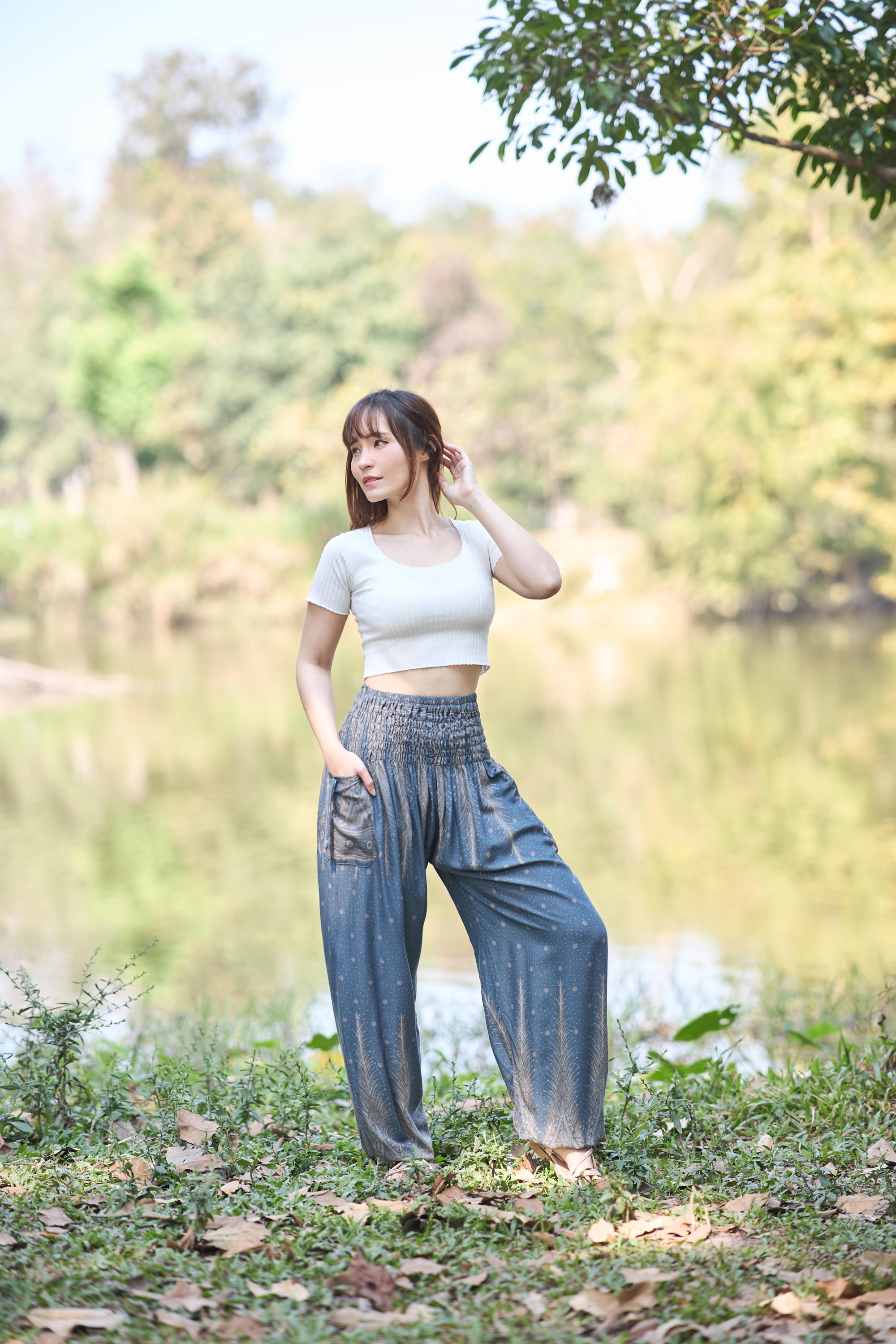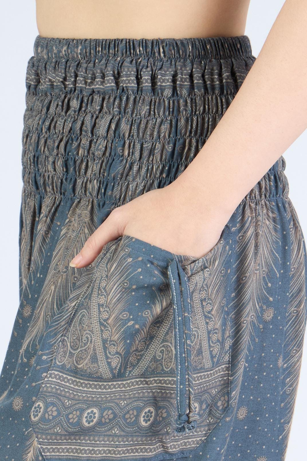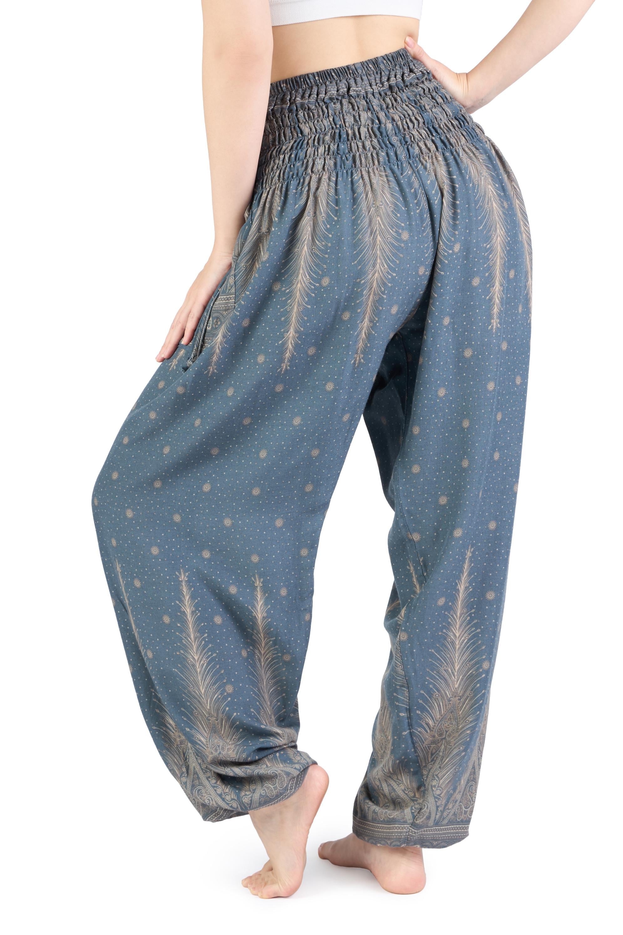 Add a touch of boho vibes to your everyday comfort with these grey peacock feather harem pants for women. Handmade from lightweight, breathable rayon, they feature a smocked elastic waist, two side pockets, and elastic ankles for an easy, flattering fit. Perfect for yoga, travel, lounging, or dancing at festivals — these boho pants blend calm grey tones with timeless peacock beauty for a relaxed, graceful look.
