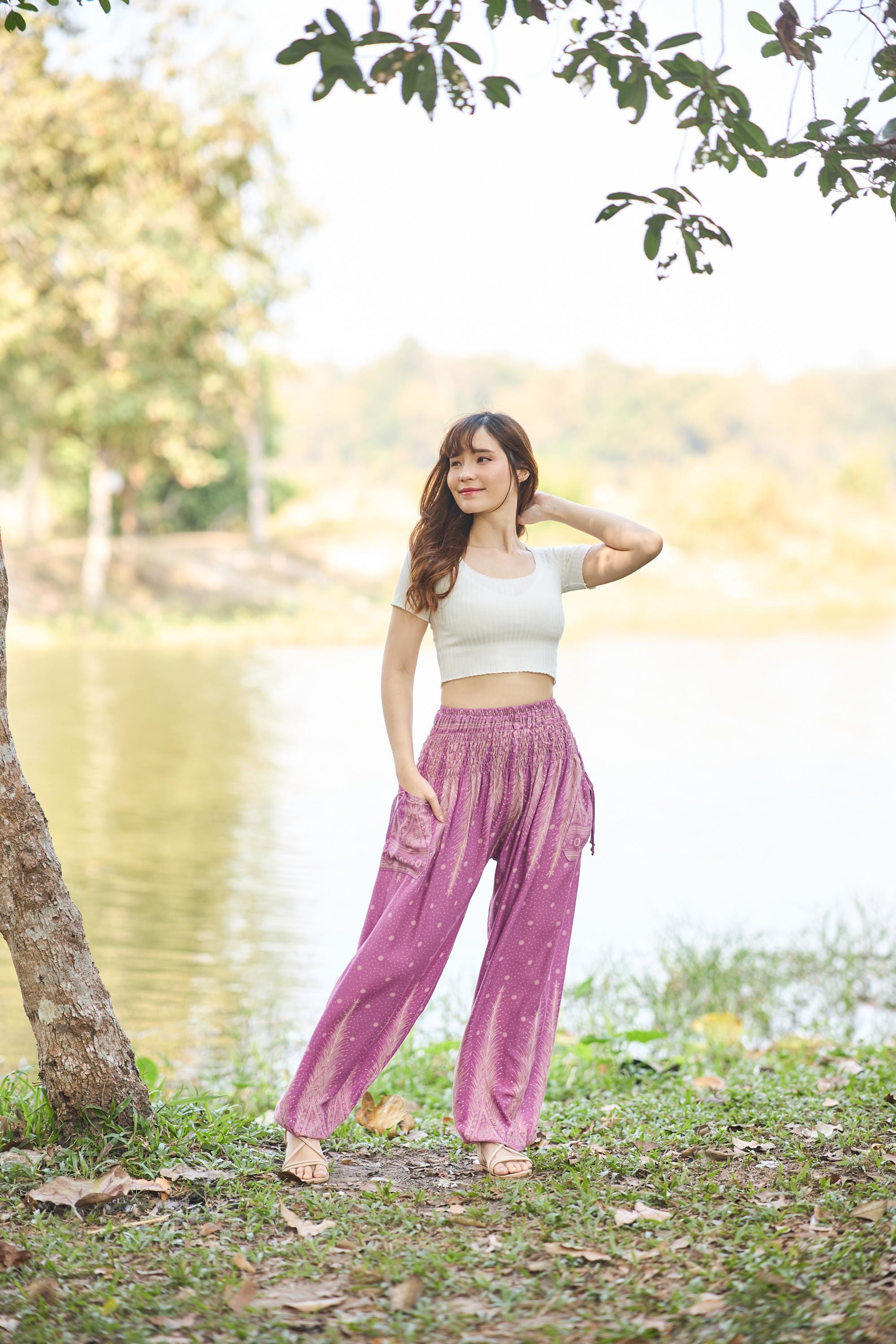 Brighten your look with these pink peacock feather harem pants for women, designed for comfort, color, and effortless boho charm. Made from soft, breathable rayon, they feature a flexible smocked waist, two side pockets, and elastic ankle cuffs for easy movement. Perfect for yoga, travel, festivals, or lounging at home — these lightweight boho pants bring a joyful pop of pink and free-spirited energy to any outfit.