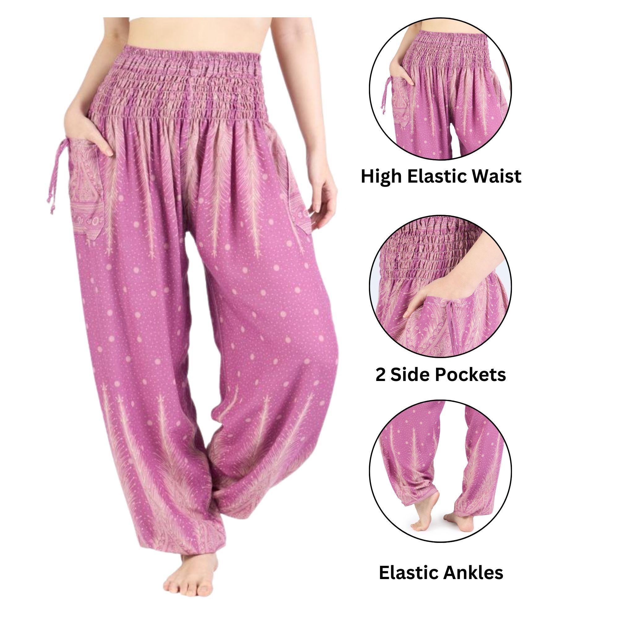 Pink Peacock Feather Harem Pants Women Boho Yoga Pants - Smocked Waist Rayon Trousers - Lightweight - 2 Pockets and Elastic Ankles - S-XXL