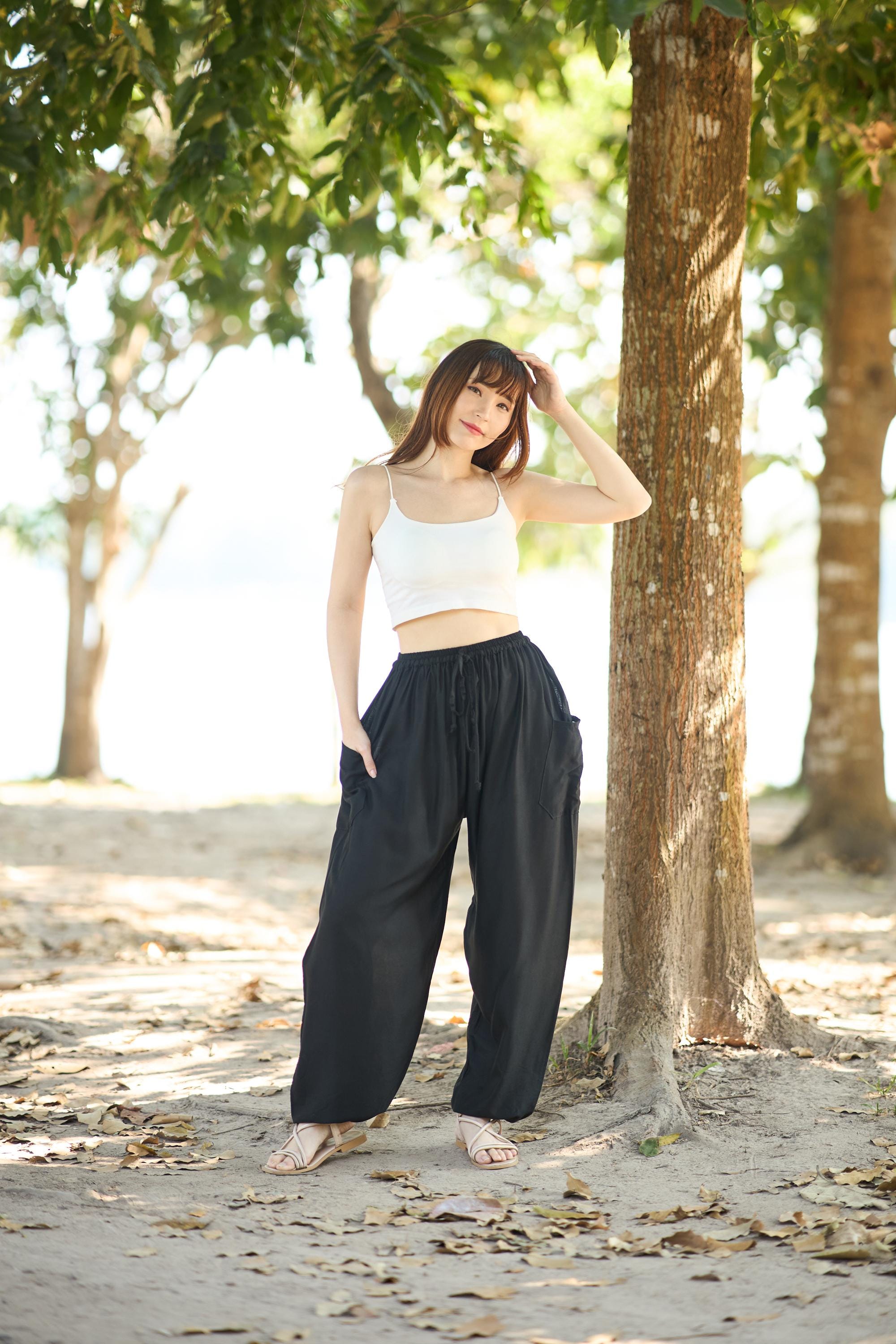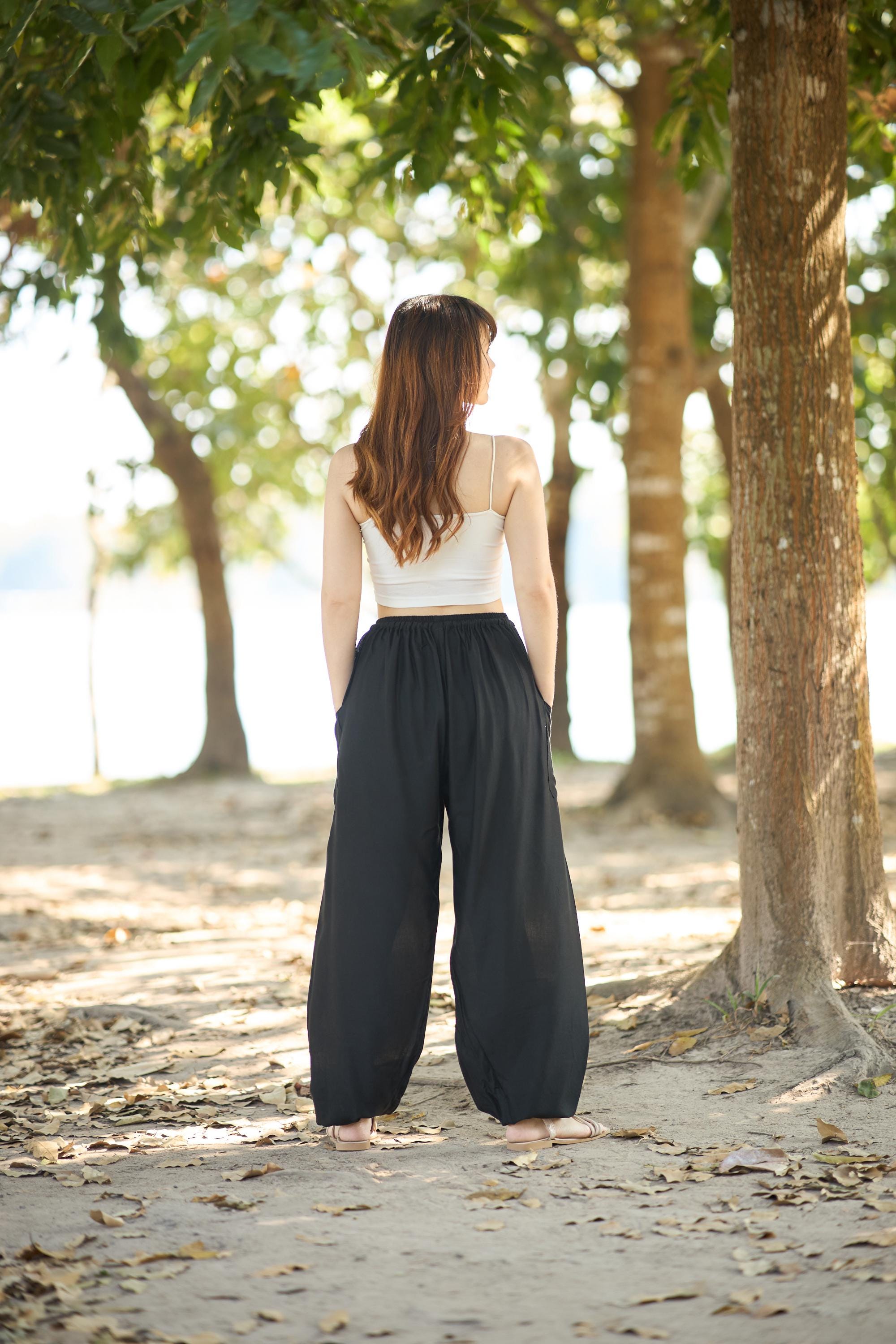 Pair these black harem pants with a crop top, tank top, or loose boho blouse for a relaxed summer vibe — or dress them up with a fitted tee and sandals for an effortlessly boho chic everyday look.