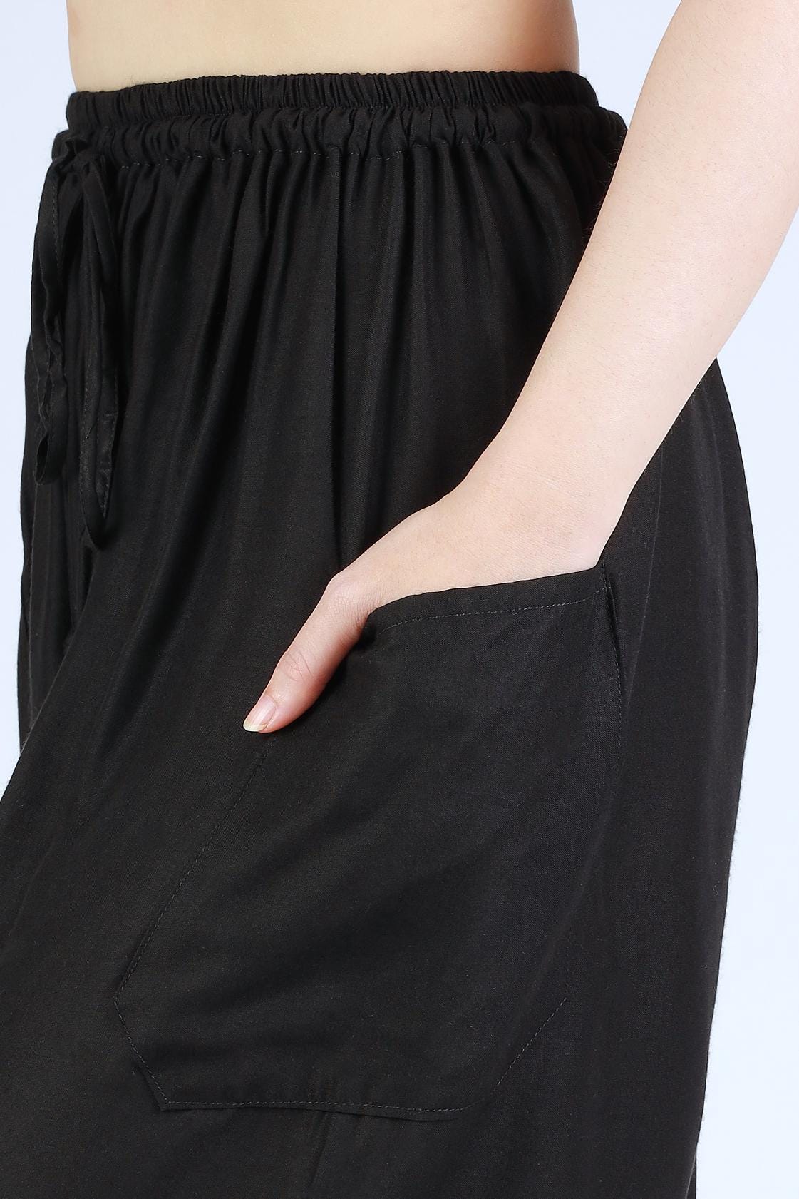 Black Harem Pants for Women – soft, lightweight, and effortlessly stylish. Handmade from breathable rayon fabric, these boho pants feature a comfortable elastic waist with adjustable drawstring, two practical side pockets, and elastic ankle cuffs for a relaxed, flattering fit.
