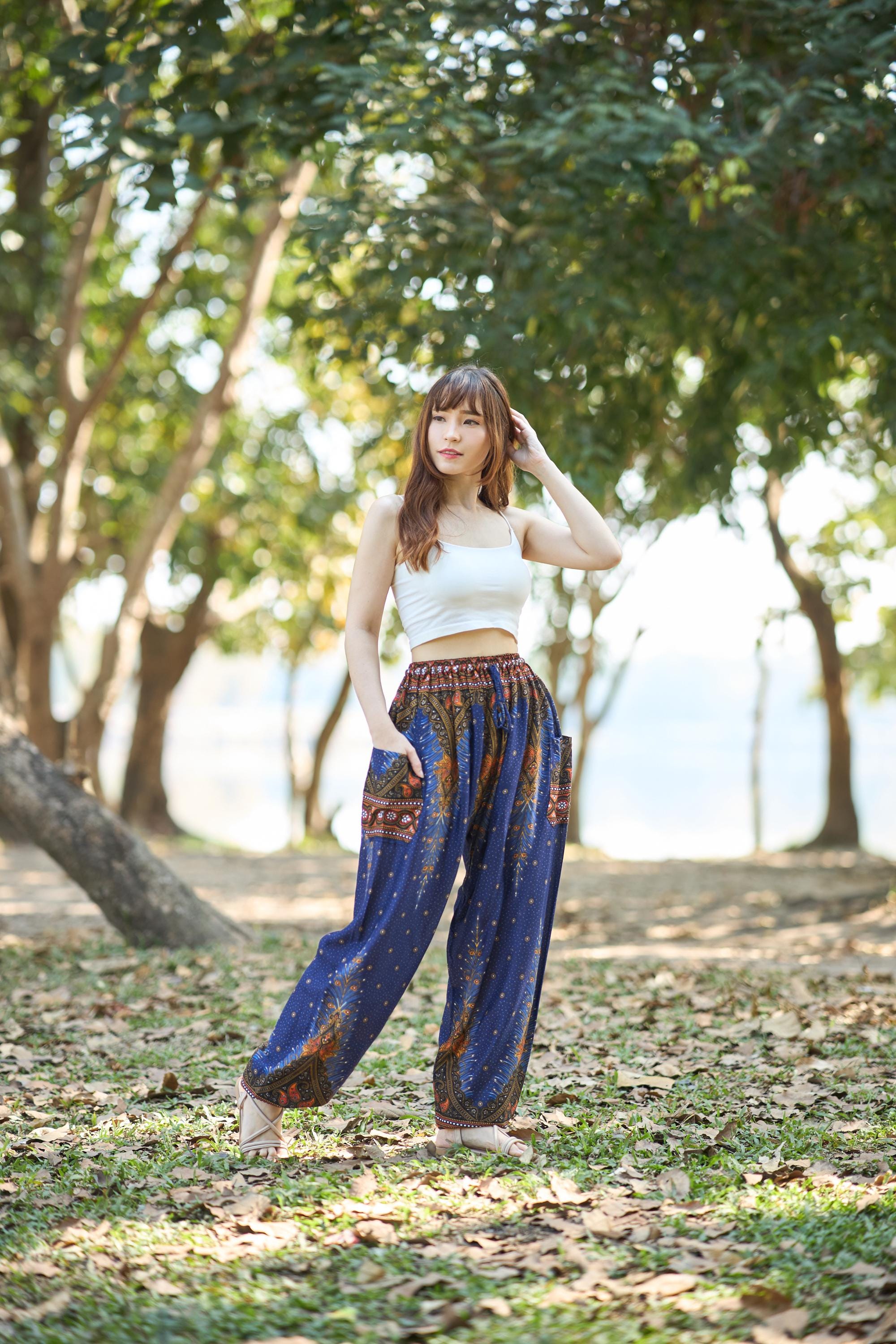 Pair these dark blue harem pants with a white or cream top, simple crop tee, or boho blouse for a fresh, laid-back look. Add sandals or flat shoes for an easy everyday outfit.