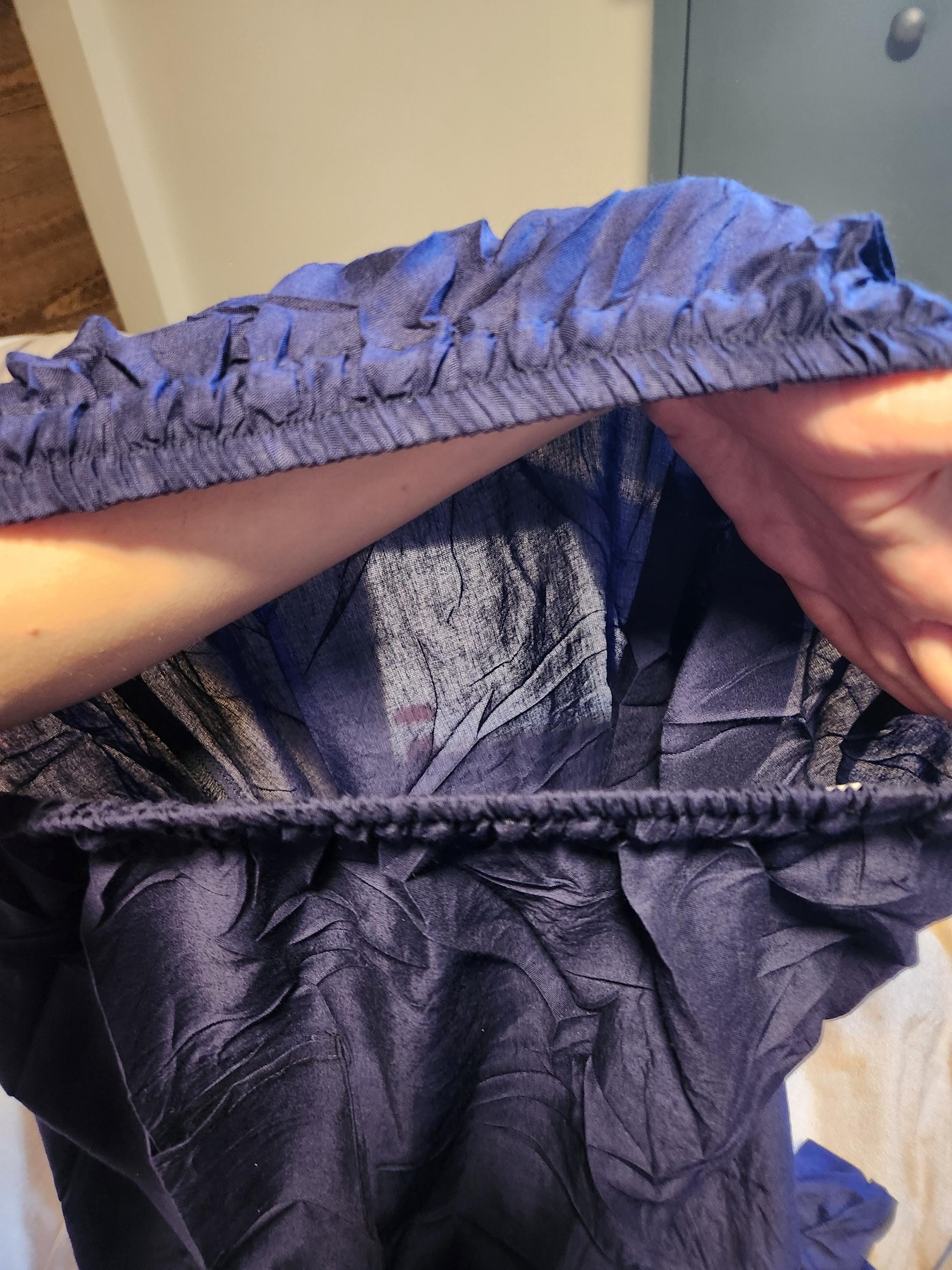The fabric is made of a cheap plastic material, like a Halloween costume. It's thin and uncomfortable to the touch, and objects can be seen through them from a distance. I have a photo demonstrating that you can see a whole document of papers through it quite easily. It seems to me that it looked like it was made of cotton in the shop's pictures, but this fabric doesn't seem to be plant based. I thought this would be a simple purchase for a simple pair of lounge pants from a shop that I assumed would be reputable. I'd find better quality at KOHL's; I feel grifted. It's also not what I was expecting. I thought it would be open cuffed, but it has elastic bands around the ankle. But it's the quality that is the deal breaker. I want to return this item.